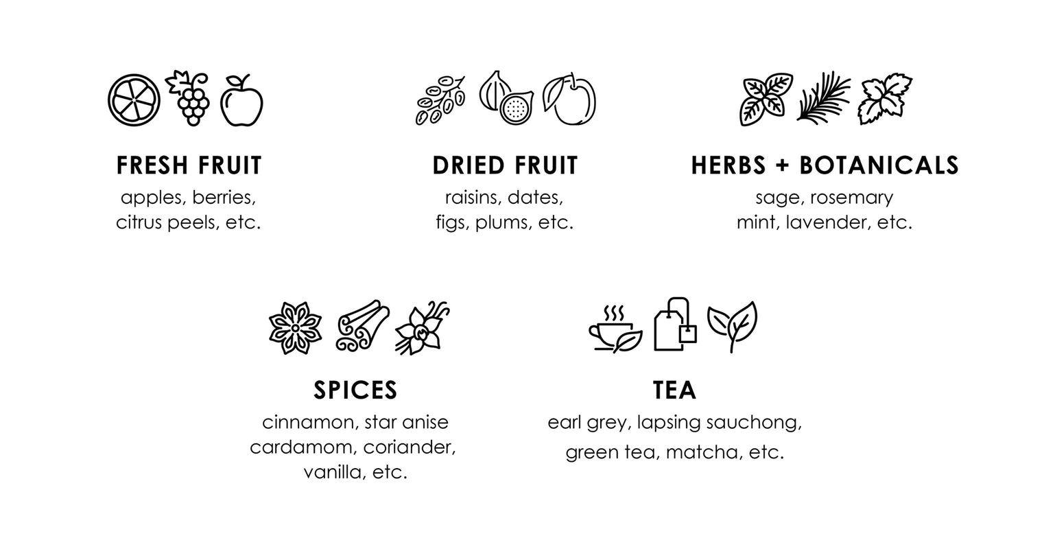 The base alcohol is the spirit you’ll add flavor to. Generally, the higher the proof, the greater the extraction power. For instance, an overproof (100+) bourbon or vodka will pull more flavor out of your infusion ingredients in comparison with a standard 80 proof bottle. Overproof spirits are ideal when you desire an intense flavor profile, or recipes that require an extended infusion time, like bitters.